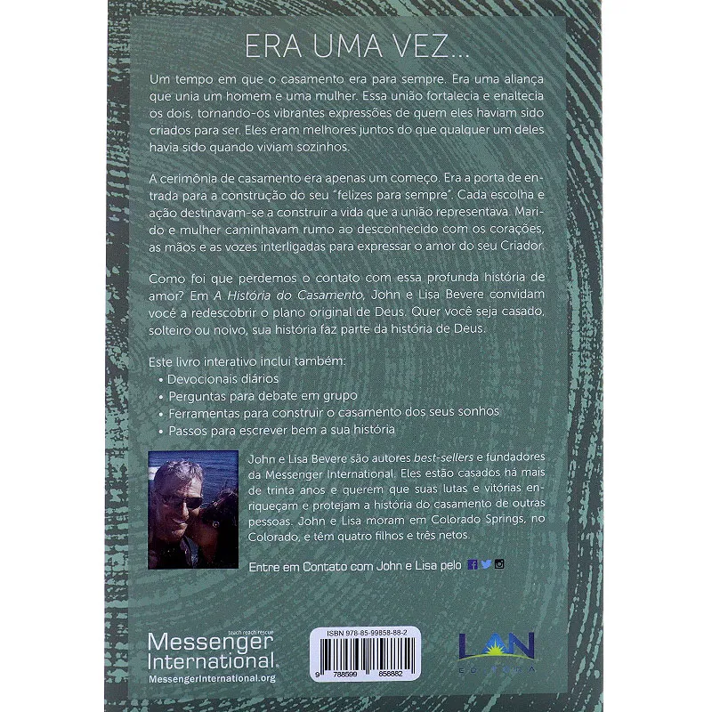 Era uma vez… …um tempo em que o casamento era para sempre. Era uma aliança que unia um homem e uma mulher. Essa união fortalecia e enaltecia os dois, tornando-os vibrantes expressões de quem eles haviam sido criados para ser. Eles eram melhores juntos do que qualquer um deles havia sido quando viviam sozinhos. A cerimônia de casamento era apenas um começo. Era a porta de entrada para a construção do seu “felizes para sempre”. Cada escolha e ação destinavam-se a construir a vida que a união representava. Marido e mulher caminhavam rumo ao desconhecido com os corações, as mãos e as vozes interligadas para expressar o amor do seu Criador. Como foi que perdemos o contato com essa profunda história de amor? Em A História do Casamento, John e Lisa Bevere convidam você a redescobrir o plano original de Deus. Quer você seja casado, solteiro ou noivo, sua história faz parte da história de Deus. Este livro interativo inclui também: Devocionais diários Perguntas para debate em grupo Ferramentas para construir o casamento dos seus sonhos Passos para escrever bem a sua história