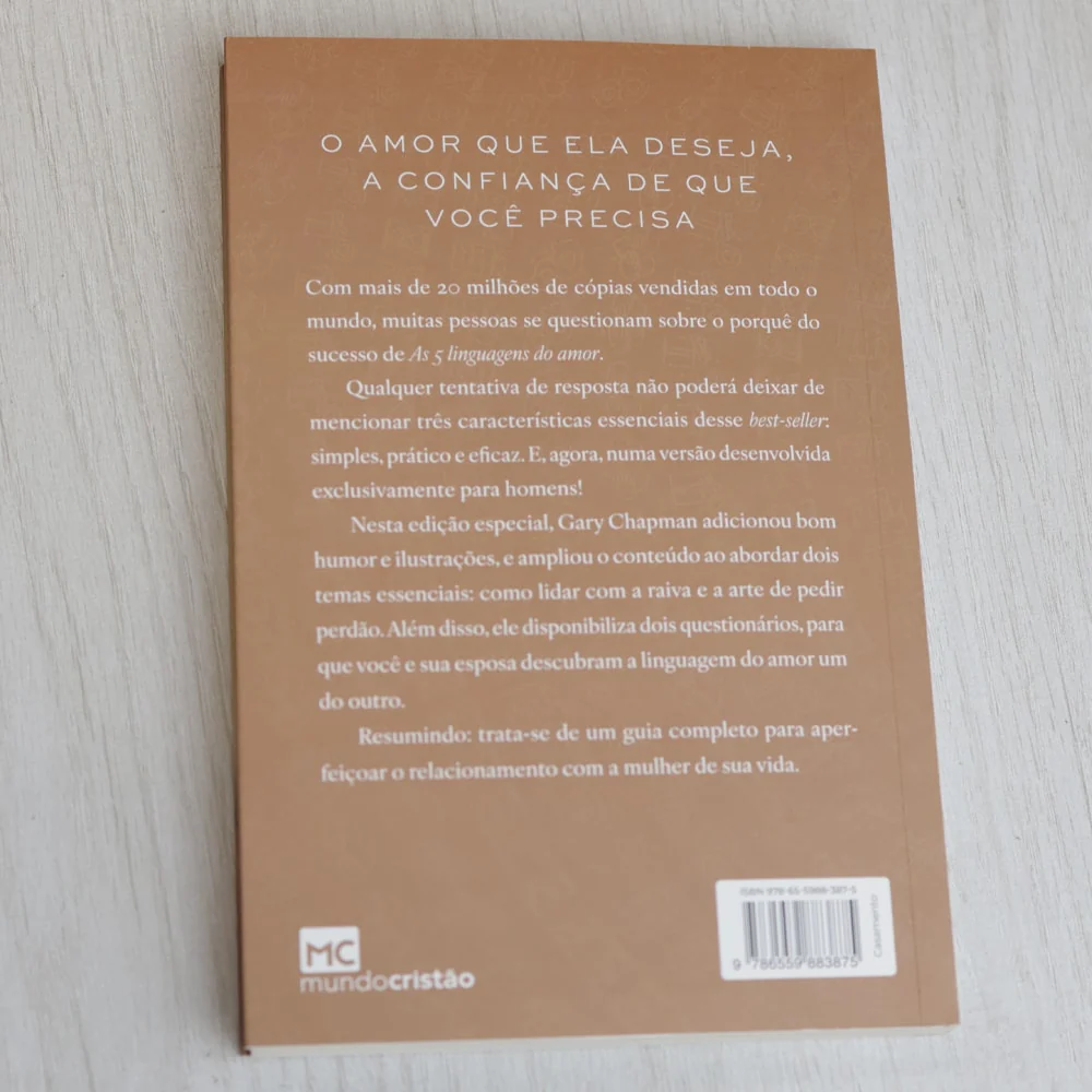 Como Expressar Um Compromisso de Amor a Sua EsposaAs cinco linguagens do amor para homens tem o potencial de melhorar grandemente o clima emocional do seu casamento. Você aprenderá a comunicar amor na linguagem de sua esposa e, com isso, ocorrerão mudanças significativas na atitude e no comportamento dela.