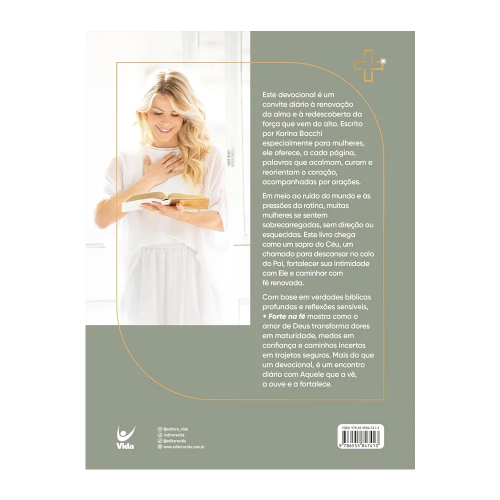 Escrito por Karina Bacchi, + Forte na Fé é um devocional para mulheres que buscam renovar a alma e fortalecer sua caminhada com Deus. Com mensagens sensíveis, orações e verdades bíblicas, este livro é um convite diário para descansar no Pai, reencontrar direção e transformar dores em maturidade e fé. Mais que um devocional, é um encontro diário com Aquele que te vê, te ouve e te fortalece.